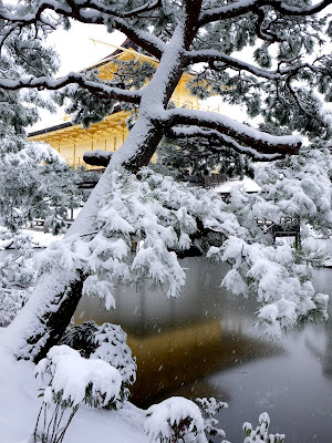 雪景色というと京都でまず思い浮かべるのは誰でも(京都人でも)金閣寺のようです。それもここ数年チャンスがなかったもので、今年はみんな大喜びです。