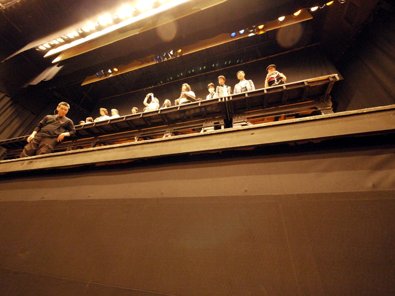南座で初めての企画として、花道や舞台を体験できるツアーというのがあったので、行って来ました(5/3~5/8)。まず、舞台にあがるので、スリッパに履き替えます。そして花道の入り口、”揚げ幕”の後ろ(狭いので”鳥屋”というそうです)から、チャリンという音をたてて、幕をあげて花道に登場です。ワクワクしながら舞台上へ。